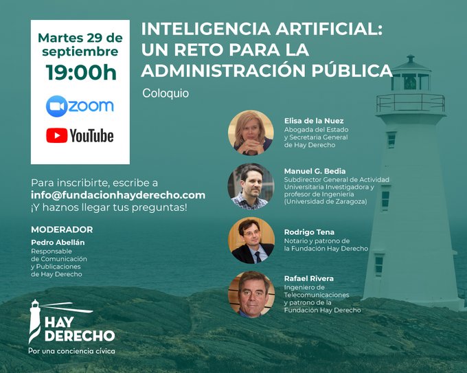 Retomamos tras el verano nuestros coloquios preguntando a los mejores expertos sobre cuestiones clave para el Estado de derecho, en la línea del trabajo que realizamos en nuestro blog y en nuestro videoblog.Así, el martes, 29 de septiembre a las 19:00 tendrá lugar el coloquio “Inteligencia artificial: un reto para la Administración Pública”, que podrá seguirse online a través de Zoom si se inscriben, y también de nuestro canal de Youtube.Participarán en el coloquio Elisa de la Nuez: Abogada del Estado y secretaria general de Hay Derecho; Manuel G. Bedia, Subdirector General de Actividad Universitaria Investigadora y profesor de ingeniería (Universidad de Zaragoza); Rodrigo Tena, Notario y patrono de la Fundación Hay Derecho; y Rafael Rivera, Ingeniero de Telecomunicaciones y patrono de la Fundación Hay Derecho.En esta conversación se analizarán los retos y oportunidades que el avance de la inteligencia artificial plantea a nuestras sociedades y, en particular, a nuestra Administración Pública: ¿estamos preparados para aprovechar todo su potencial? ¿Qué riesgos supone? ¿Qué planes tiene el Gobierno para su implementación?